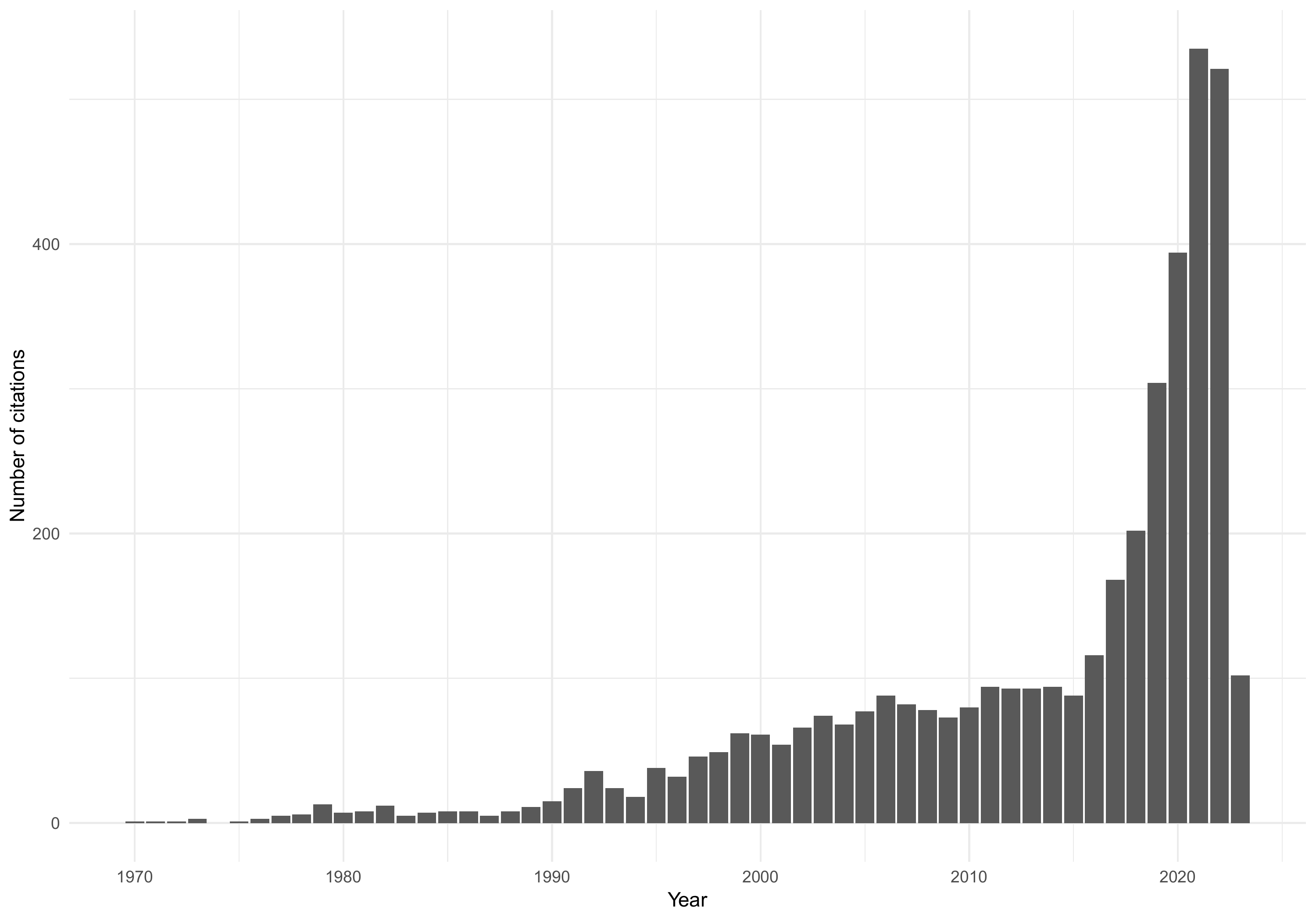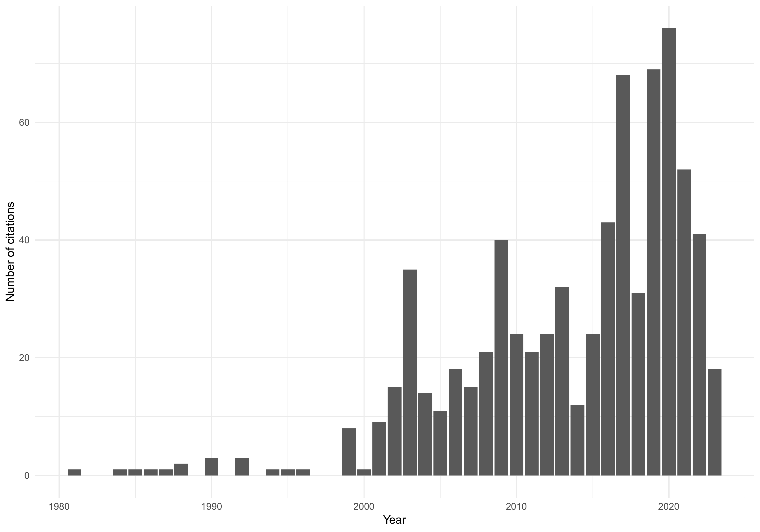 Figure 1 indicates a steady increase in scholarly citations to GESAMP publications over time. Citations slightly increased after 2000 but fluctuated consistently every few years, and 2016 marks the beginning of a sharp increase in citations. Citation counts after 2020 may not accurately represent the full reach of publications, as citations take time to accumulate.