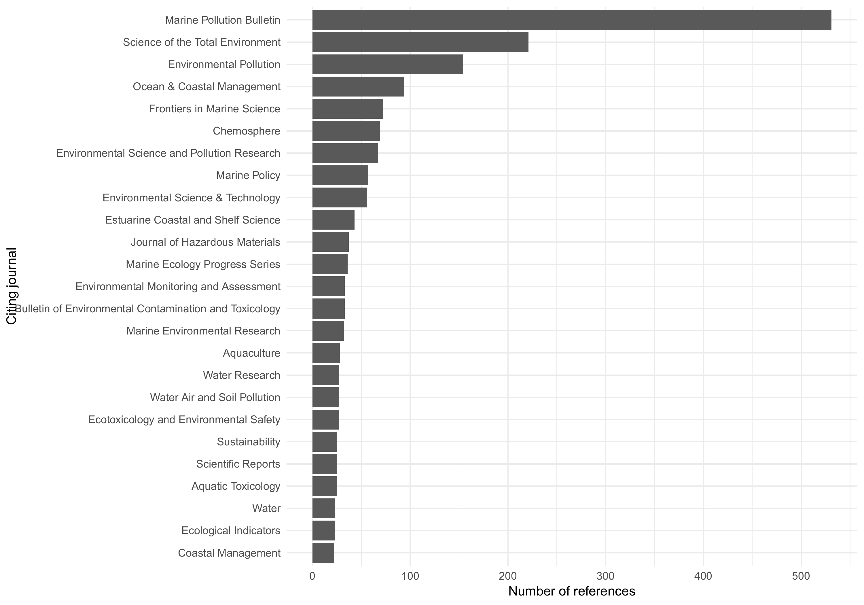 GESAMP publications have been cited in works published by 1,120 journals. Figure 2 presents the top 25 journals that have cited GESAMP publications the most, with Marine Pollution Bulletin being the journal in which GESAMP publications are the most cited, and by a substantial number. This journal cited GESAMP literature over twice as much as Science of the Total Environment, which has the second highest number of citations to GESAMP work. Environmental Pollution, Ocean & Coastal Management, and Frontiers in Marine Science, comprising the rest of the top 5 journals citing GESAMP publications, indicate a focus on pollution and ocean management. The topic of pollution is also present among the remaining top 20 journals (such as Environmental Science and Pollution Research, Bulletin of Environmental Contamination and Toxicology, and Water Air and Soil Pollution) as are the subjects of toxicology and hazardous materials (Chemosphere, Journal of Hazardous Materials, Ecotoxicology and Environmental Safety, and Aquatic Toxicology), indicating the relevance and utility of GESAMP literature to research published in these journals. Other journals tend to focus on science, technology, ecology, environmental/marine research, and management, whereas topics relating to policy appear less represented. However, several key marine management journals, such as Marine Policy and Coastal Management, show significant interest in GESAMP work.