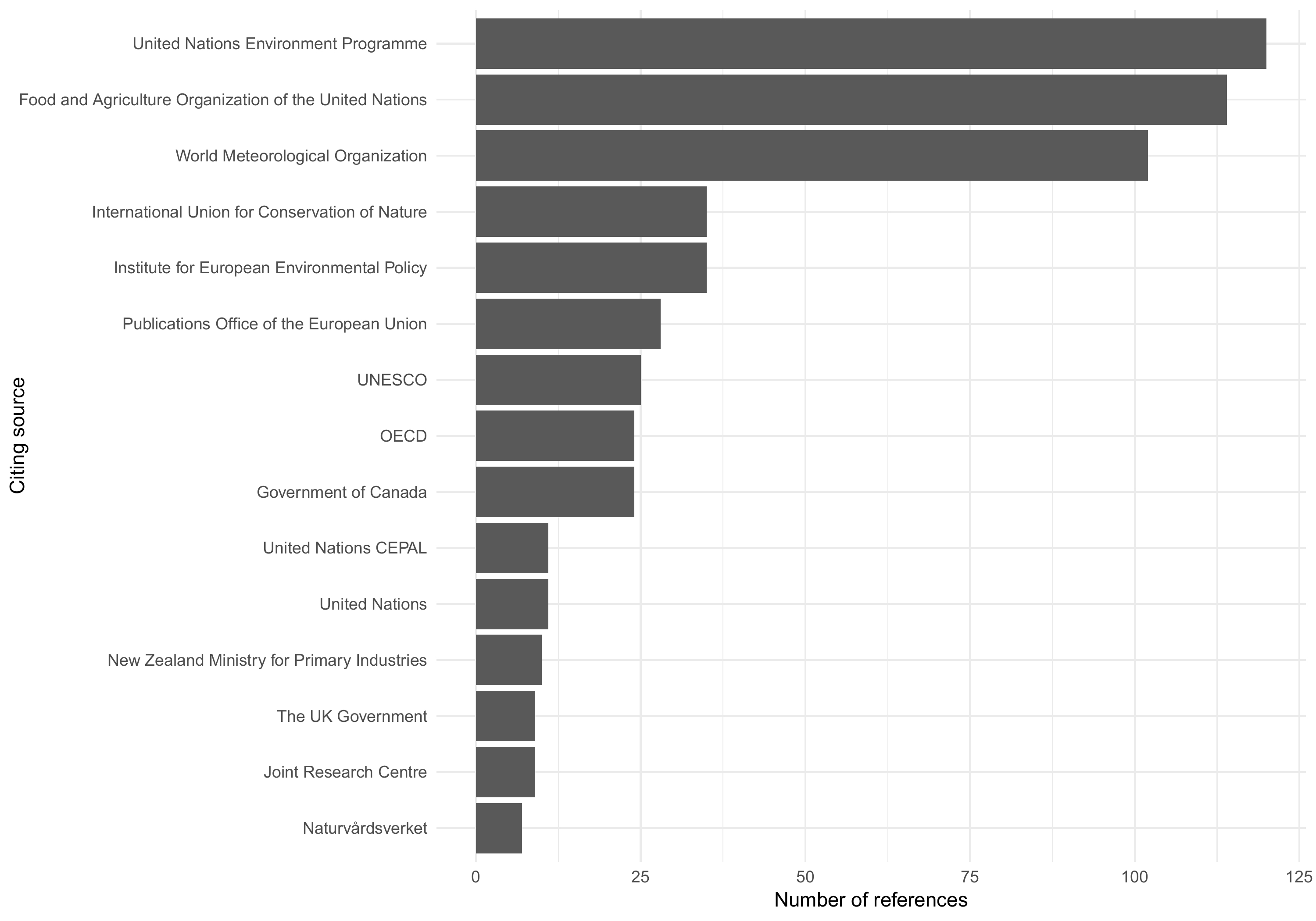 Figure 4 shows the top 15 policy sources citing GESAMP literature. The United Nations Environment Programme and the Food and Agriculture Organization of the United Nations are the top two citers of GESAMP literature. Data collected from Overton reveals frequent self-citations of GESAMP to its own work; the top two citers corroborate the finding that the UN often draws on its own work to advance and build knowledge. Other top citers include the International Union for Conservation of Nature, the World Meteorological Organization, and UNESCO, which shows strong international confidence in GESAMP literature for their work. Other global bodies that are not solely mandated for environmental protection or have dedicated environmental units include the World Health Organization and the World Bank. Specific national or international actors include the State of South Australia (concerned mainly with protecting the Great Barrier Reef), Natural Resources Institute Finland, the German Institute for Economic Research, and the Publications Office of the European Union.