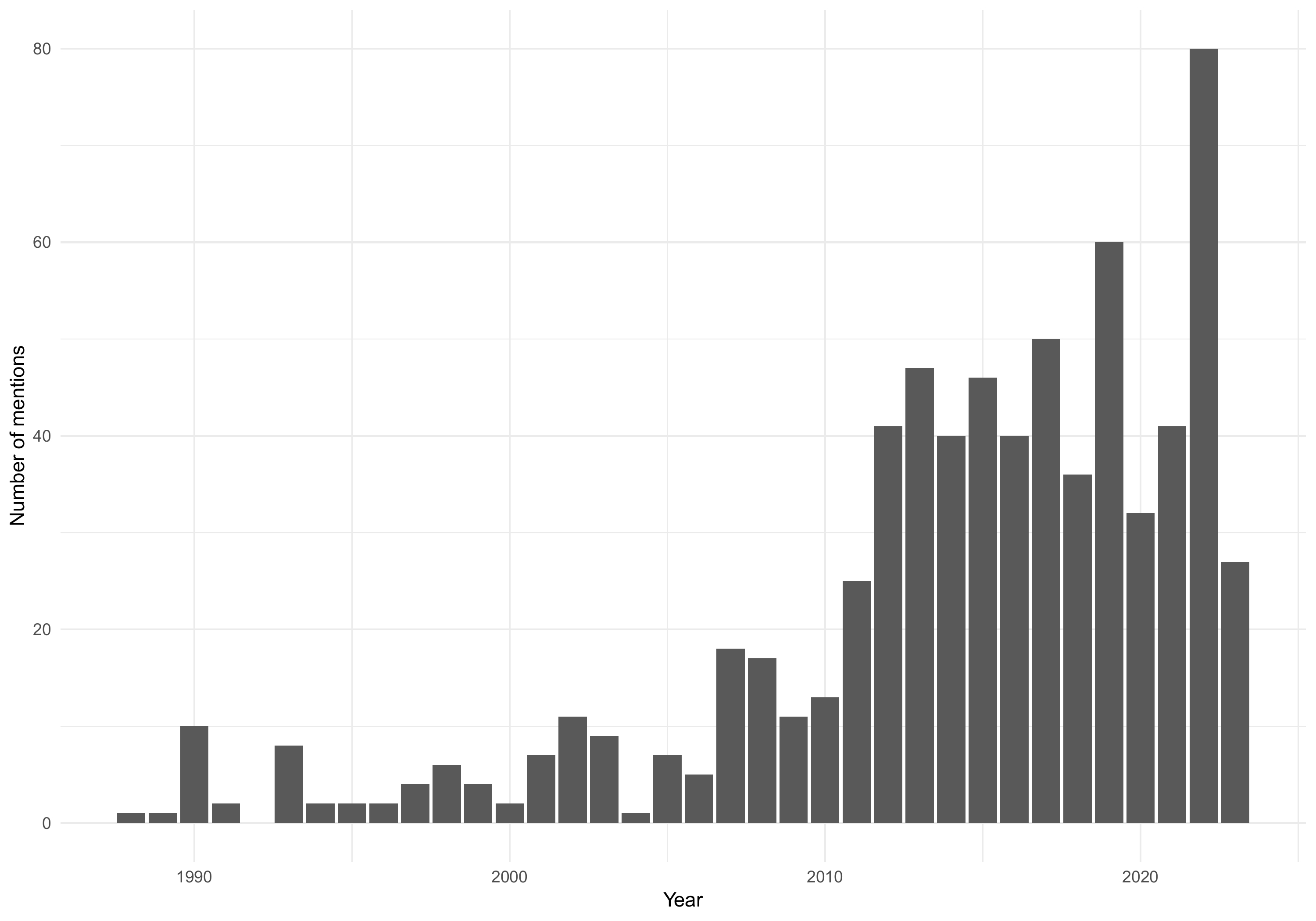 As Figure 1 and Figure 3 showed an increase in citations in scholarly work and policy documents to GESAMP literature, Figure 5 also reveals a positive trend over the past two decades. After 2010, a noticeable rise in news mentions of GESAMP publications can be observed. In 2022, in particular, there was a marked rise in news mentions, likely due to increased mainstream attention to the UN’s declared Decade of Ocean Science for Sustainable Development (2021-2030) and the ongoing climate emergency (UNESCO, 2017; UNESCO-IOC, 2023).