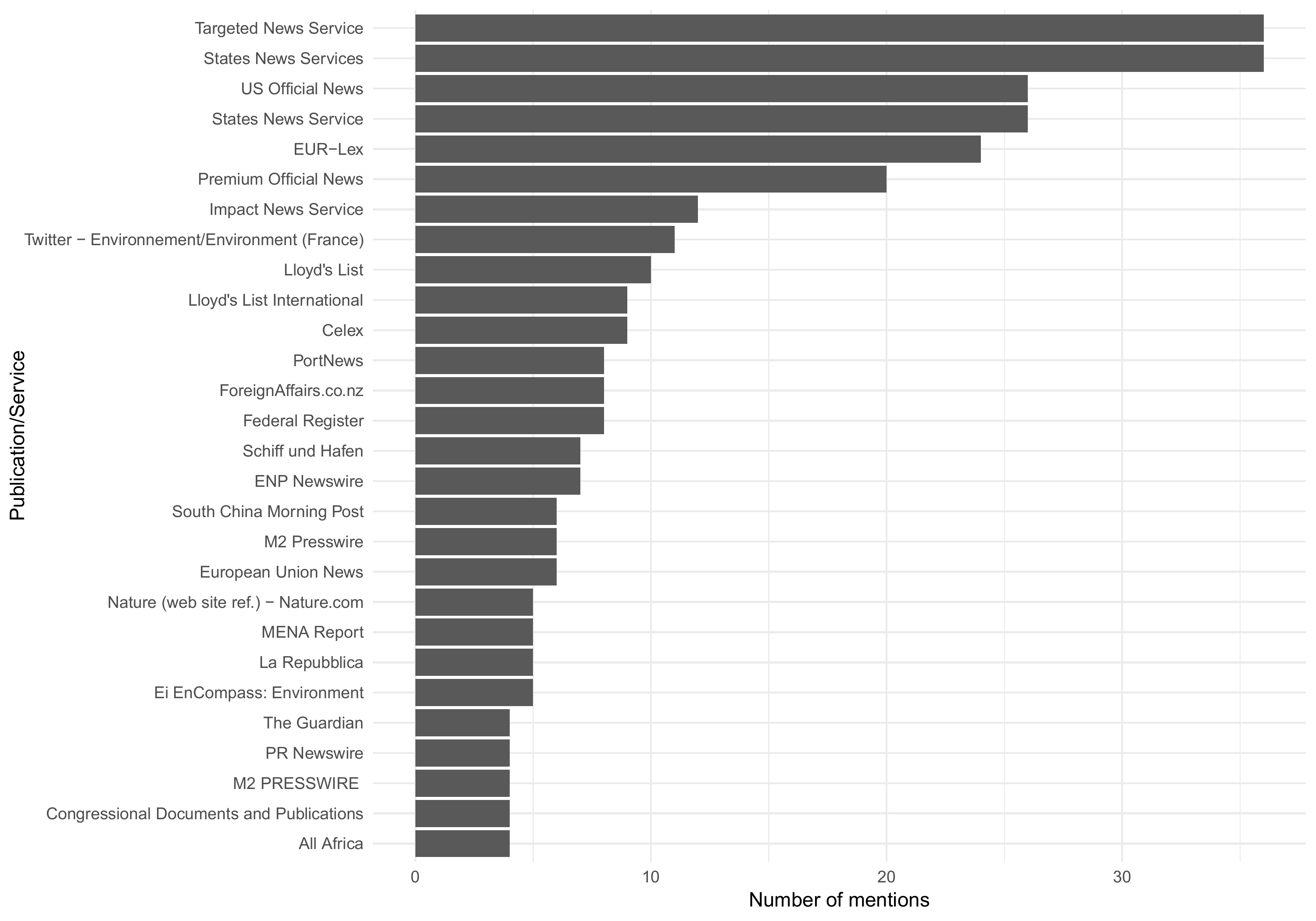 These new works were published by 336 different publications/services, of which the top 25 are shown in Figure 6 below. Three of the top sources are American, indicating that American news services are paying more attention to GESAMP publications. The top news sources are otherwise distributed across global news services, with representation from organizations such as All Africa, South China Morning post, and ForeignAffairs (New Zealand), as well as a large proportion of European news sources: Schiff und Hafen (Germany), La Repubblica (Italy), EUR-Lex, Twitter- Environnement (France), Lloyd’s List (England), and European Union News. Overall, the representation of international news services is less than that of national sources. The World Bank (MENA Report) is also represented in top news sources, as it is among the top policy citers in the GESAMP literature, being the only organization, other than the European Union, to be represented in both policy and news groups.